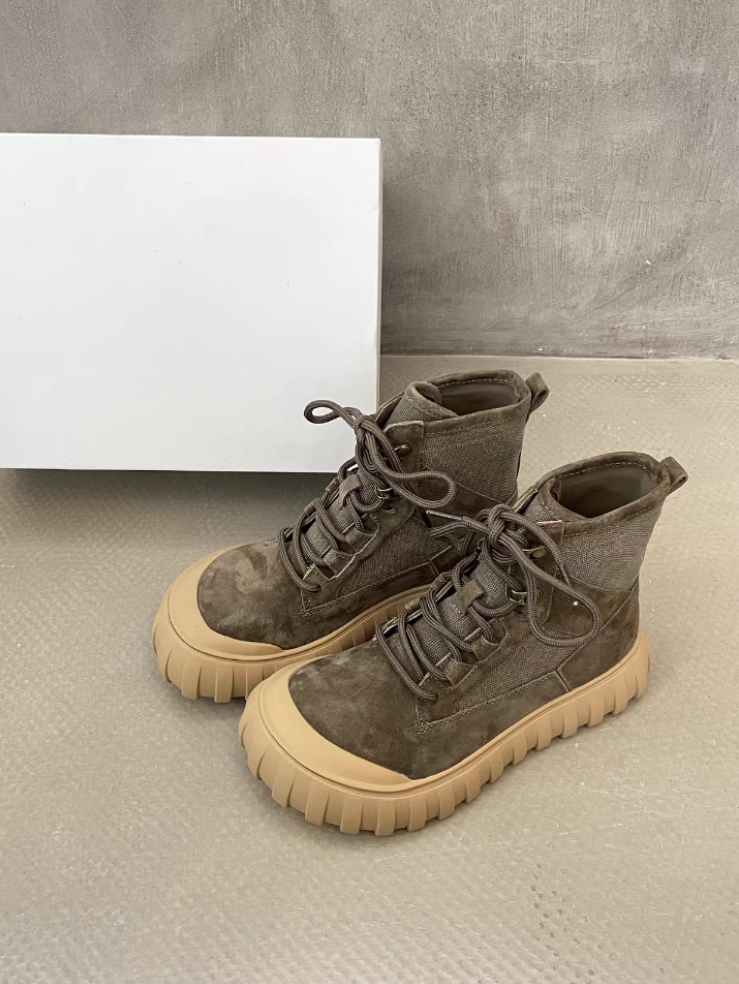 + Free ShippingMake a statement with these dark brown distressed combat boots, where rugged design meets modern comfort. The soft suede upper features a unique vintage distressed finish that adds character and depth, while the chunky beige platform sole provides enhanced support and a trendy lifted silhouette. With a classic lace-up front and a high-top ankle design for added stability, these boots seamlessly blend functionality and fashion. Ideal for pairing with jeans, skirts, or cargo pants, they’re a versatile staple for elevating any casual outfit with a touch of urban edge.